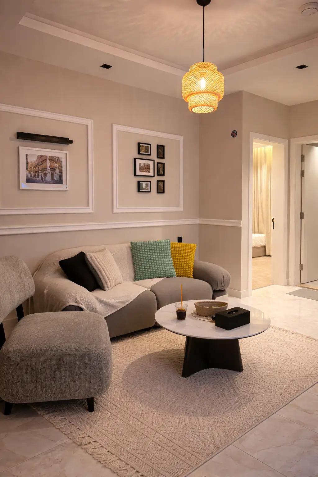 غرفتي نوم مريحتين وصالة واسعة بتصميم راقٍ يوفر أجواء دافئة للاسترخاء وقضاء وقت ممتع مع العائلة.