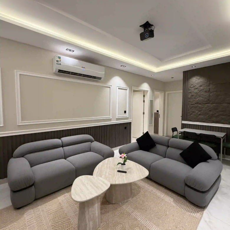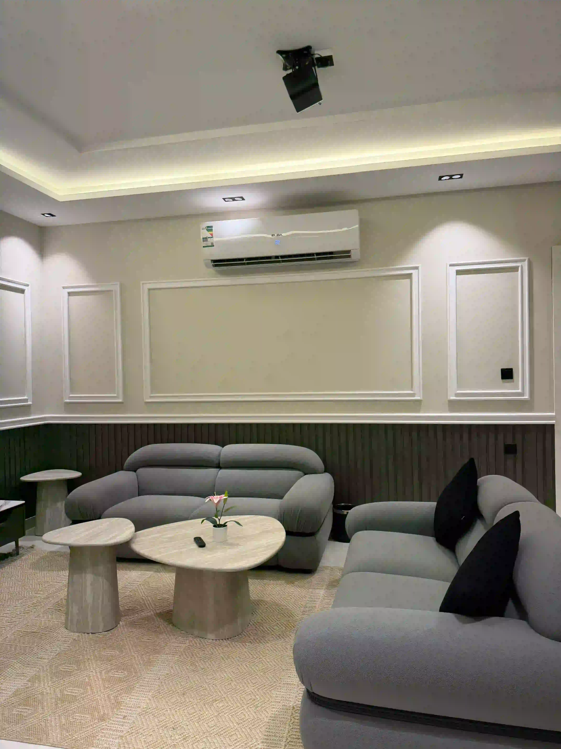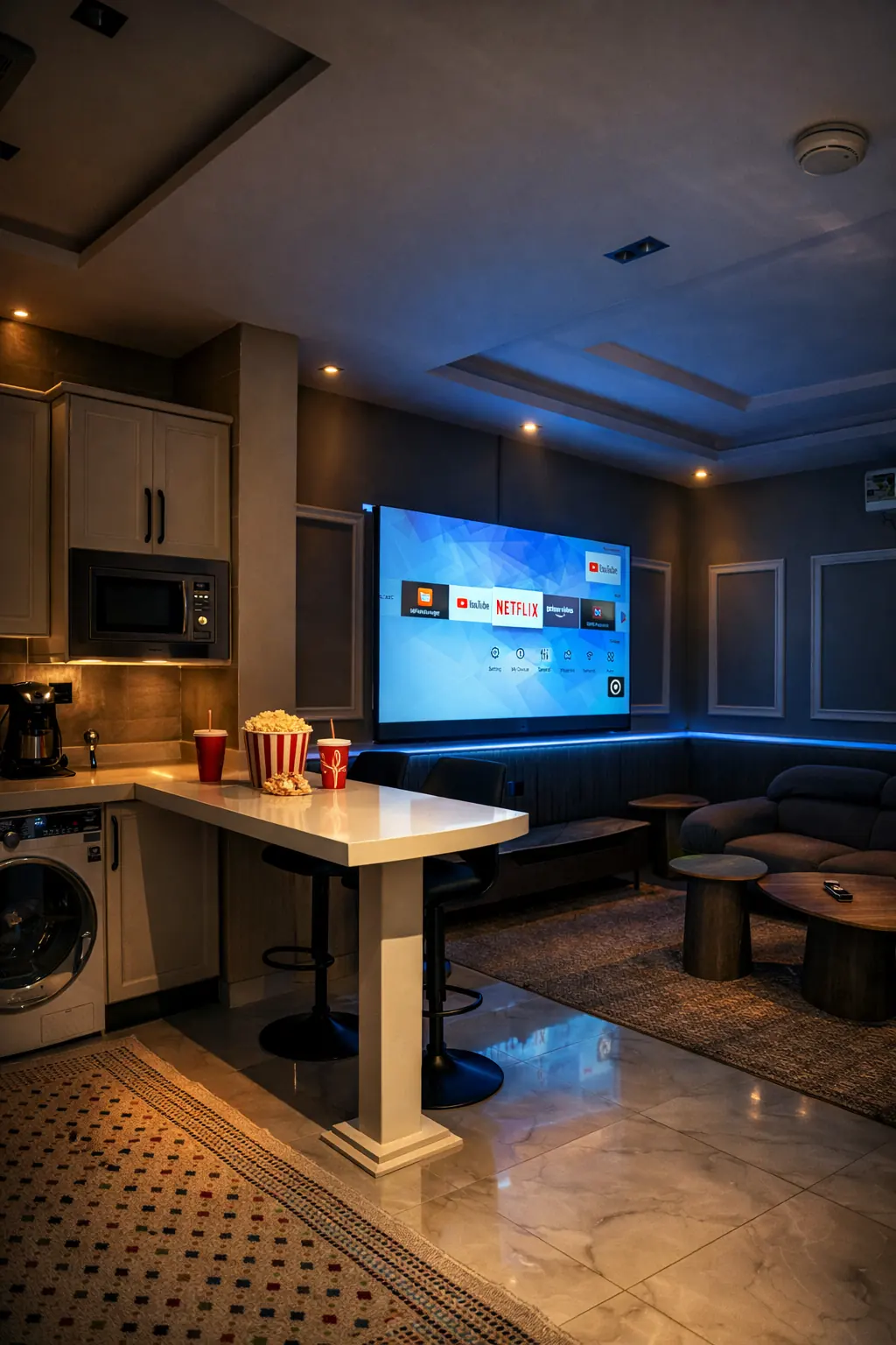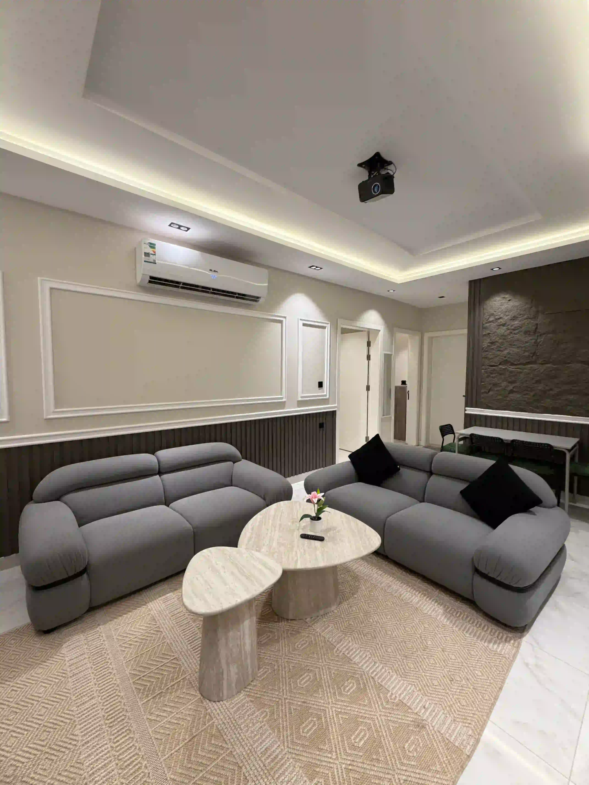 استمتع بإقامة راقية في شقّة لاكجري فاخرة تضم غرفتي نوم أنيقتين مصممتين لراحة وهدوء تام، مع تجربة سينما منزلية مميزة عبر شاشة بروجكتر عالية الجودة لتحظى بأجواء سينمائية خاصة داخل الشقّة.
