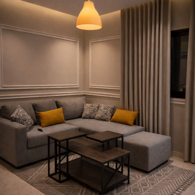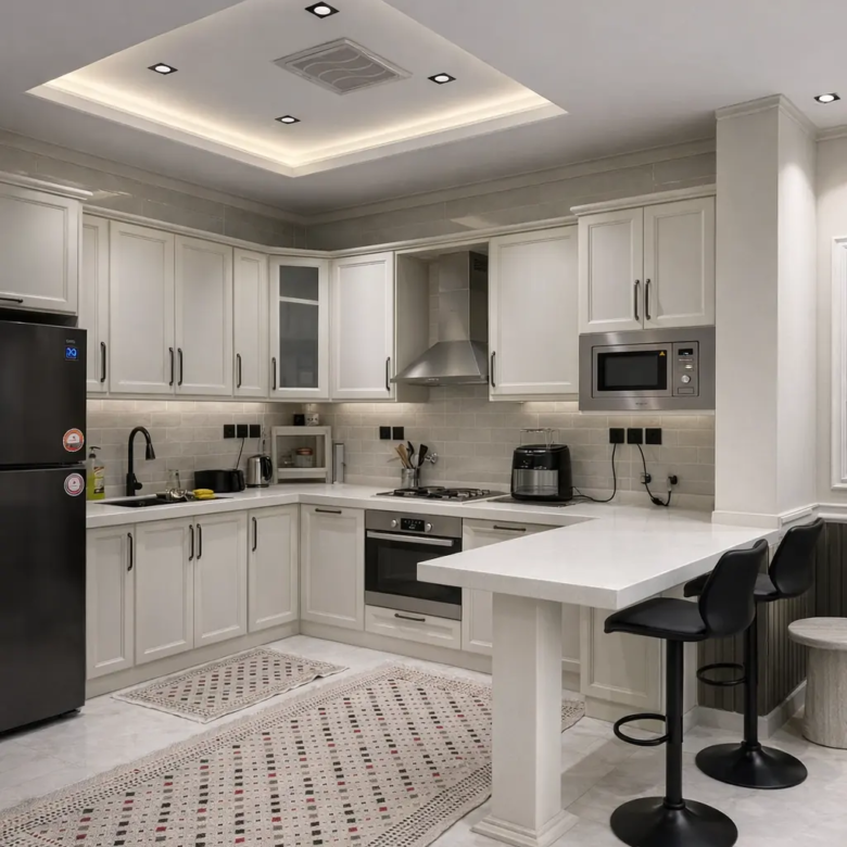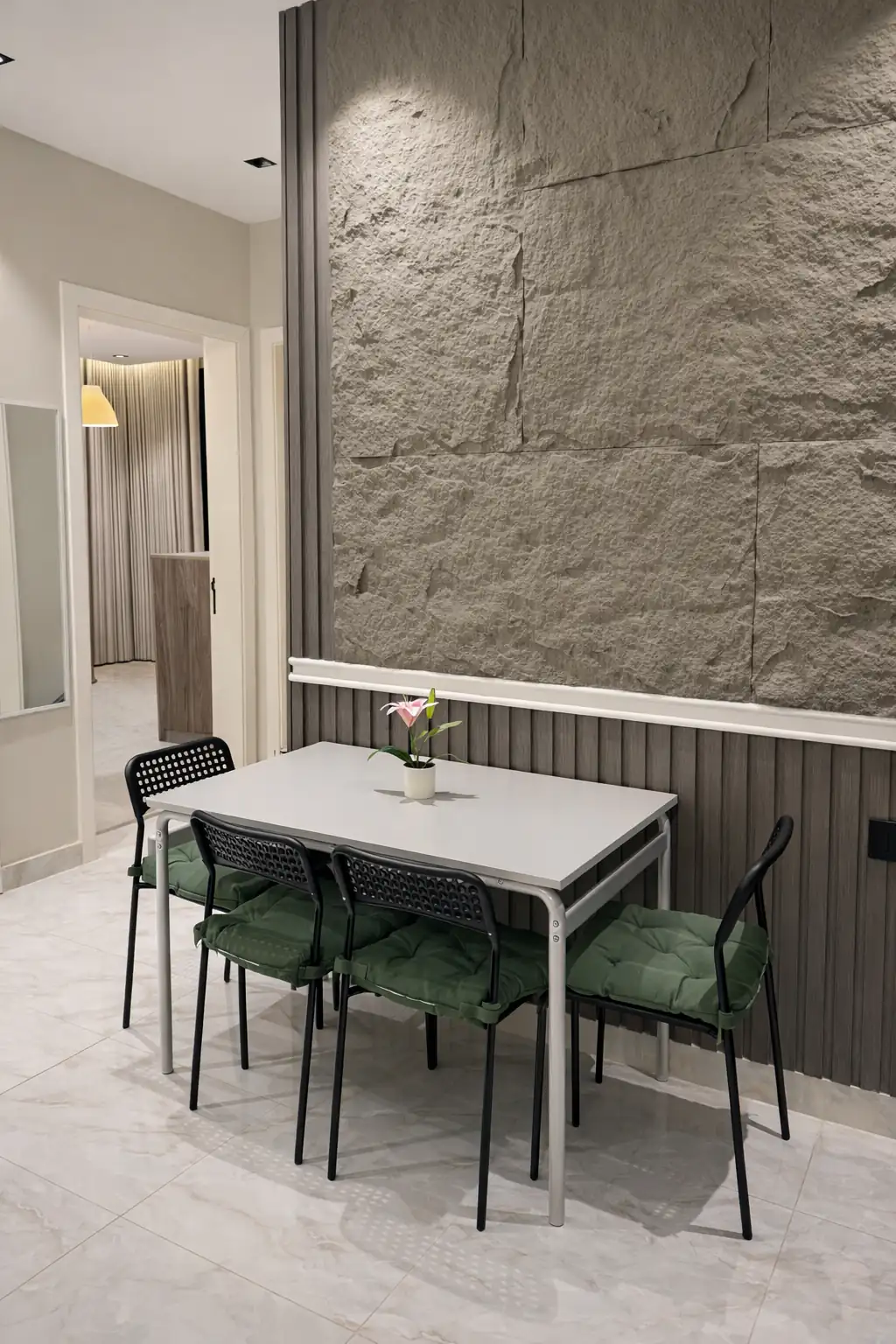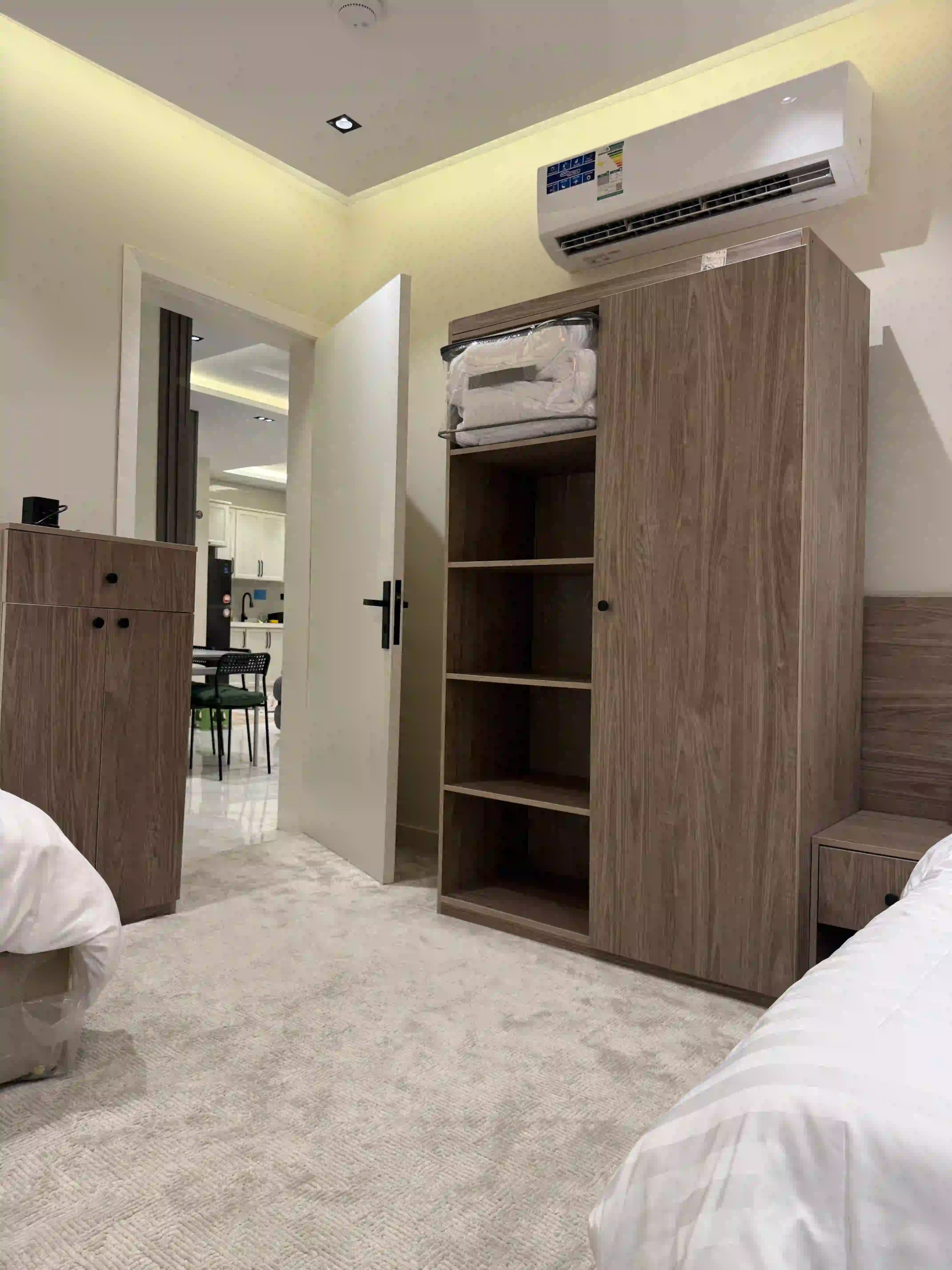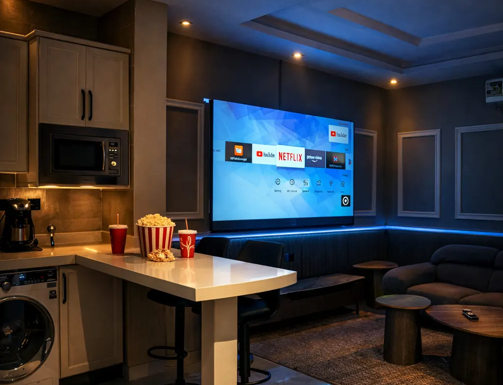استمتع بإقامة راقية في شقّة لاكجري فاخرة تضم غرفتي نوم أنيقتين مصممتين لراحة وهدوء تام، مع تجربة سينما منزلية مميزة عبر شاشة بروجكتر عالية الجودة لتحظى بأجواء سينمائية خاصة داخل الشقّة.
